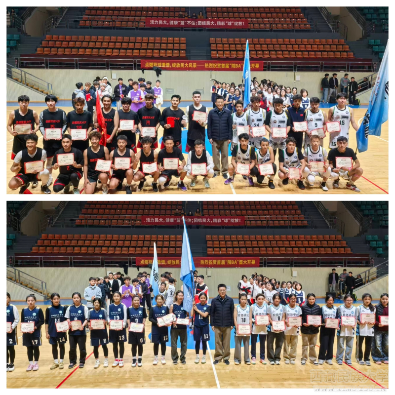 校长罗旺次仁,校团委、体育学院负责人等亲临决赛现场观赛,并为获奖学院和个人颁奖。经过激烈角逐,最终法学院夺得男子组冠军,新闻与传播学院、中华民族共同体学院分获男子组二、三名;教育学院荣获女子组冠军,财经学院、中华民族共同体学院位列女子组二、三名。体育学院男女代表队凭借出色表现获得并列第一。在三分球大赛中,中华民族共同体学院、体育学院、教育学院分获男子组前三名;体育学院、网络空间安全学院和文学院则包揽女子组冠亚季军。