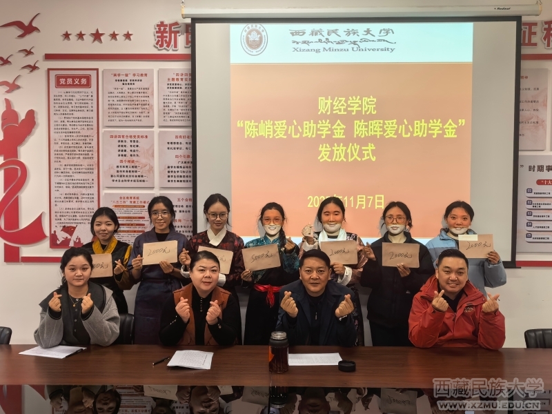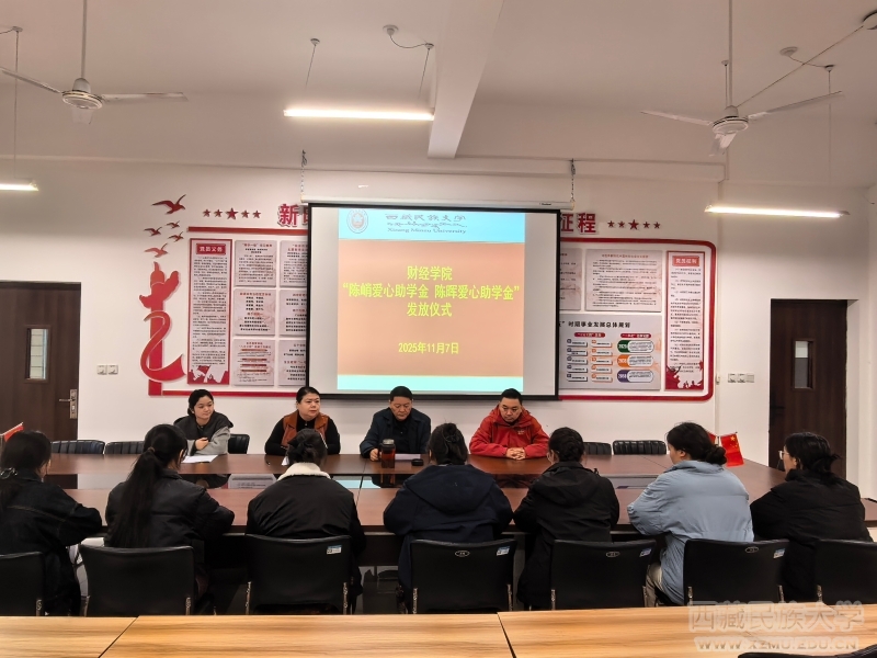 11月7日上午,财经学院在经管楼115会议室举办2025年度“陈峭爱心助学金”和“陈晖爱心助学金”发放仪式。学院党委书记拉巴顿珠、党委副书记杨红出席,学工办主任、辅导员及全体受助学生参加发放仪式。