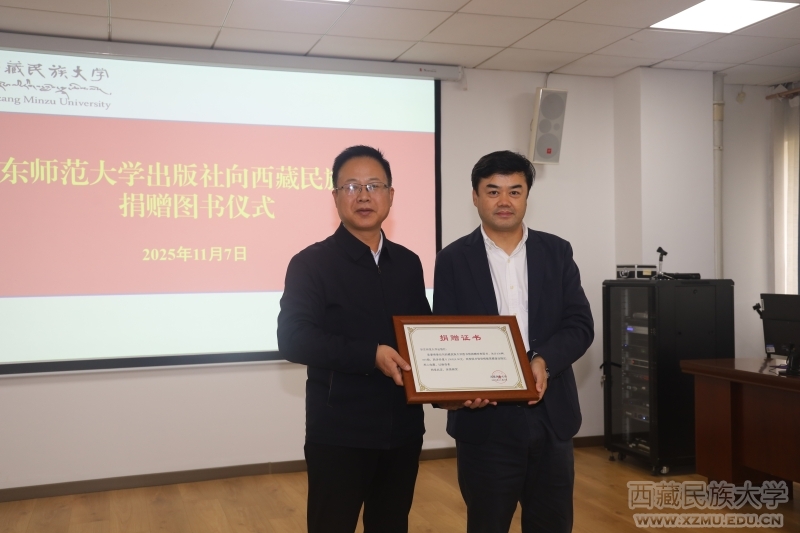 在全场见证下,王健代表华东师范大学出版社向西藏民族大学捐赠图书,焦忠武副校长代表学校向华东师范大学出版社赠送了捐赠证书。