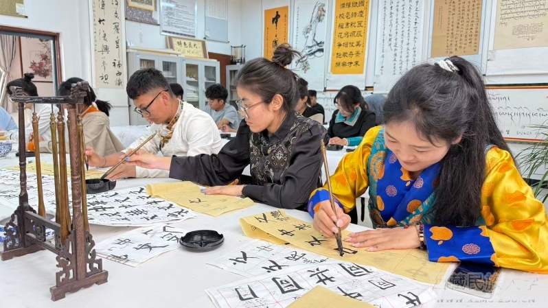 基地的成功,得益于其扎实的“硬核”支撑。它深度融合了“西藏自治区高校中华优秀传统文化艺术藏文书法基地”的资质与国家级创业实践项目“博扎书法实训室”的资源,构建起“理论学习+技艺训练+实践创作”三位一体的传承体系。截至目前,基地已成功举办六期汉藏文书法培训和五期“铸牢”主题理论学习会,累计吸引本硕博1200余名各族学子参与。这个以“书绘共同体”为特色的平台,已成为“我们在一起”品牌中“写在一起”的核心载体,让中华民族共同体意识在笔墨交融中具象化、常态化。
