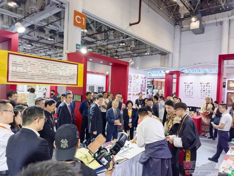 扎西曲吉参加福建省厦门市第十六届海峡两岸(厦门)文化产业博览交易会 现场书写“团结统一”的汉藏双语书法作品并作讲解