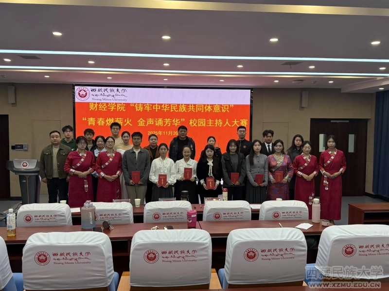 为深入夯实铸牢中华民族共同体意识教育,贯彻落实学校“我们在一起”特色品牌要求,展现学子朝气蓬勃的精神风貌,11月20日晚,财经学院在经管楼411报告厅举行“铸牢中华民族共同体意识——青春燃薪火,金声诵芳华”校园主持人大赛决赛。学院党委书记拉巴顿珠、党委副书记杨红、团委书记张雪涛及学生代表共计百余人参加活动。