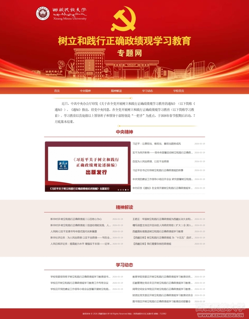 为深入贯彻落实党中央关于在全党开展树立和践行正确政绩观学习教育的重大部署,深刻领会学习教育的核心要义与实践要求,引导全校党员干部、师生员工筑牢思想根基、凝聚奋进力量,坚定不移以高质量党建引领学校事业高质量发展,奋力谱写建设教育强国、服务西藏现代化建设新篇章,3月20日,西藏民族大学“树立和践行正确政绩观学习教育专题网”正式上线运行。