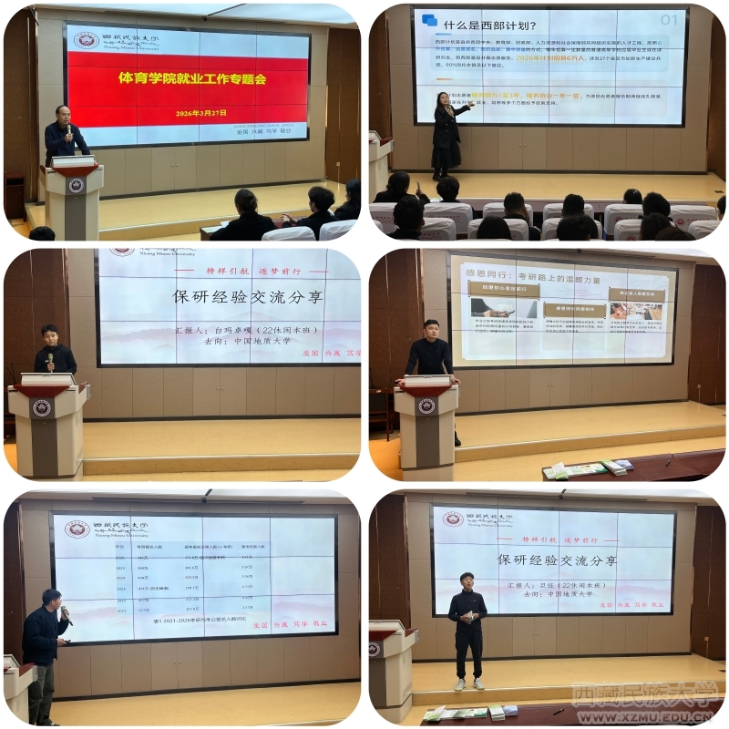 团委书记廖雪娇围绕大学生志愿服务西部计划开展政策解读与经验分享,从招募对象、服务岗位、报名流程、服务期限、保障待遇、升学就业优惠等方面进行全面讲解,重点介绍服务西藏、基层教育、健康乡村、基层治理等专项内容,明确服务期满后在考研加分、学费补偿、助学贷款代偿、公务员定向招录、事业单位招聘等方面的支持政策。就业联系人扎西卓嘎聚焦西藏地区就业形势作专题分析,结合西藏基层教育、公共体育、文体服务等领域人才需求,详细解读当地就业政策、岗位类型与发展空间。同时对大学生应征入伍、市场就业补贴政策、创业补贴政策等进行宣传和解读,发放相关的宣传册,让同学们能够更充分了解相关政策。
