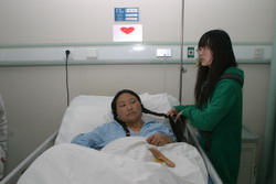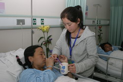 目前,学院30余名青年志愿者轮班在交大二附院照顾陪护玉树地震危重伤员。每天早晨志愿者从学院坐车赶往交大二附院,忙碌完一天的工作,伤员休息后,再从交大二附院赶回学院。中午在医院吃盒饭,时间来不及的时候就吃一点自带的方便食品。志愿者们表示,看着玉树的同胞在自己的照顾下伤势好转、康复出院,再苦再累都觉得值得。