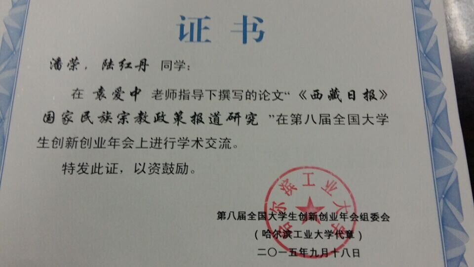 参加此次年会的作品是“《西藏日报》国家民族宗教政策报道研究”,系我校2014年“大学生创新创业训练计划”国家级项目阶段性成果。该作品由新闻传播学院袁爱中教授指导,论文主要采用文献分析法与实地调研法,对《西藏日报》近60年来的宗教政策报道内容进行分析总结,并在此基础上对《西藏日报》宗教报道提出合理化建议。该论文2015年6月获得西藏自治区“成才杯”二等奖,并将于10月份参加由广州工业大学主办的第十四届全国大学生“挑战杯”决赛。