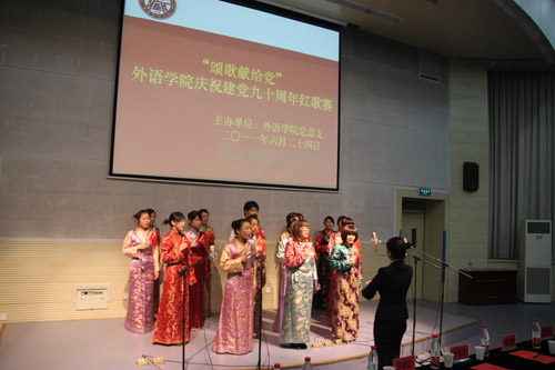 6月24日晚,外语学院党总支举办“颂歌献给党”红歌赛,庆祝建党90周年。外语学院党总支书记、副院长夏青,院长郝景春,党总支副书记高全孝,副院长赵家红观看了比赛。以班为单位,17支代表队参加了比赛,300余名各族学生共同庆祝中国共产党成立90周年,用自己的歌声抒发对党、对祖国、对社会主义的热爱。