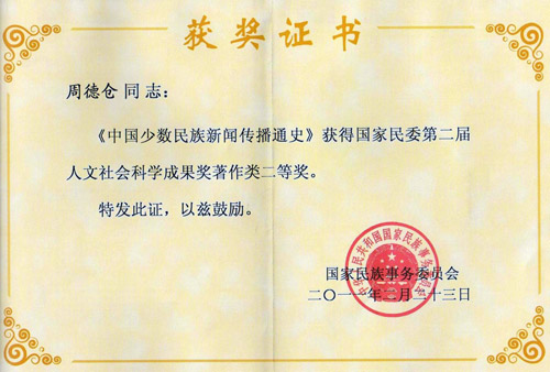 近日,由新闻传播学院周德仓教授参与的《中国少数民族新闻传播通史》荣获国家民委第二届人文社会科学成果奖著作类二等奖,并获具名奖励证书。