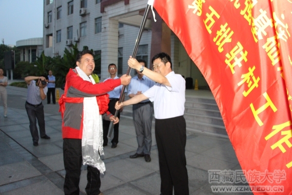 2015年7月,学校第五批驻村工作队出征,党委书记杜建功为驻村工作队副领队王斌礼授旗。
