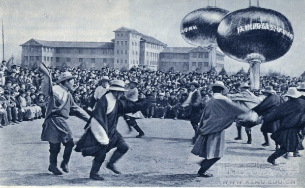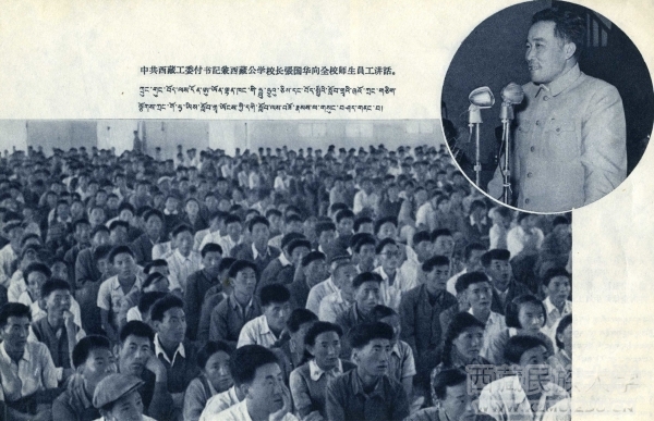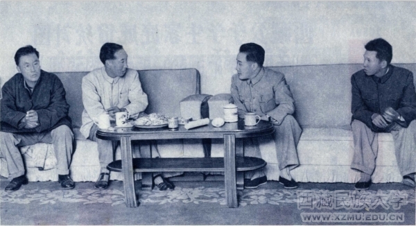 1958年,张国华校长和学校藏族干部亲切交谈,鼓励全校同志努力工作,为建设繁荣幸福的西藏贡献全部力量。