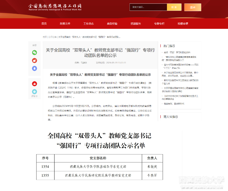 日前,教育部思想政治工作司公示了《全国高校“双带头人”教师党支部书记“强国行”专项行动团队名单》,经过严格申报和相关遴选,我校医学院基础医学系党支部、民族研究院民族学教研室党支部成功入选。
