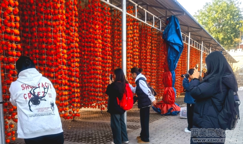 富平柿饼以营养丰富、果肉黏蜜、含糖量高而著称,被誉为“制饼珍品”。在古法挂柿加工区域,同学们仔细观察每一个步骤,了解传统工艺的精妙之处,感叹从柿子的挑选、晾晒到最后的挂制,每一道工序都蕴含着人类的智慧。