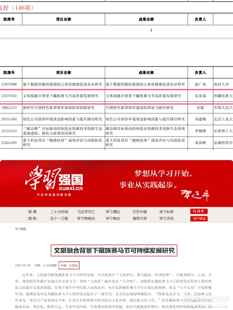 近日,全国哲学社会科学工作办公室公布了2025年2月国家社科基金年度项目结项情况,体育学院朱亚成博士主持完成的2023年度国家社科基金西部项目《文体旅融合背景下藏族赛马节高质量发展研究》顺利结题,并获得“良好”等级,这也是他主持完成的第二项国家社科基金项目。