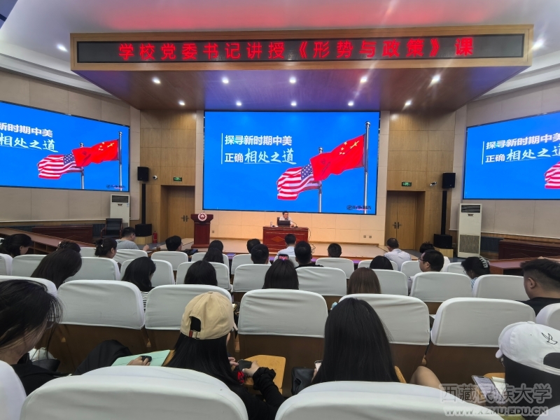 在课堂上,采守宽以“中美关系历史发展”为切入点,围绕中美关系历经跌宕起伏、特朗普再度执政的影响、解好中美关系的必答题等方面,从历史纵深和现实观照的双重视角,深刻讲解了探寻新时期中美关系正确相处的道理、学理和哲理。授课中,他通过丰富翔实的史实和精彩案例,旁征博引,全面回顾了中美关系的发展历程;尤其在分析当前国内外形势时,深入结合西藏发展和学校实际,突出学贺信、稳就业、促发展的重要性。在讲解回答好中美关系的必答题关键在于做好我们自己的事时,他还积极与师生互动交流,让在场师生们对当前中美关系有了更为清晰的认识和理解。最后,任晓伟副校长对课程进行了总结,就处理中美关系问题向学生们提出了三点希望。