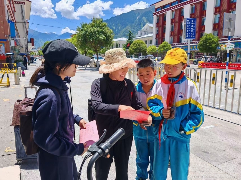 实践团师生在林芝市第二小学门口发放“推普”宣传册
