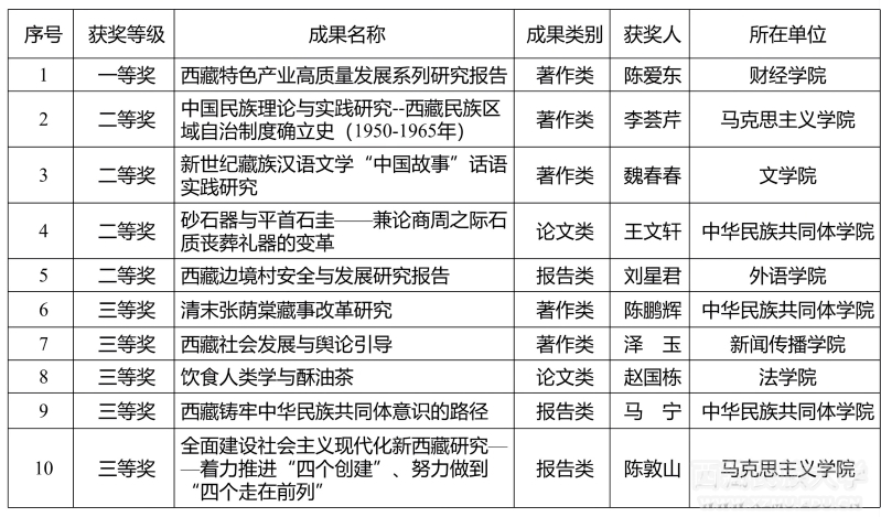 近日,第二届西藏自治区哲学社会科学优秀成果奖获奖名单正式公布。在此次评选中,西藏民族大学科研成果表现突出,共有10项成果获奖,其中一等奖1项、二等奖4项、三等奖5项,获奖总数实现历史新突破,涵盖学术著作、研究论文和研究报告三类,整体获奖层次与比例位居全区前列。