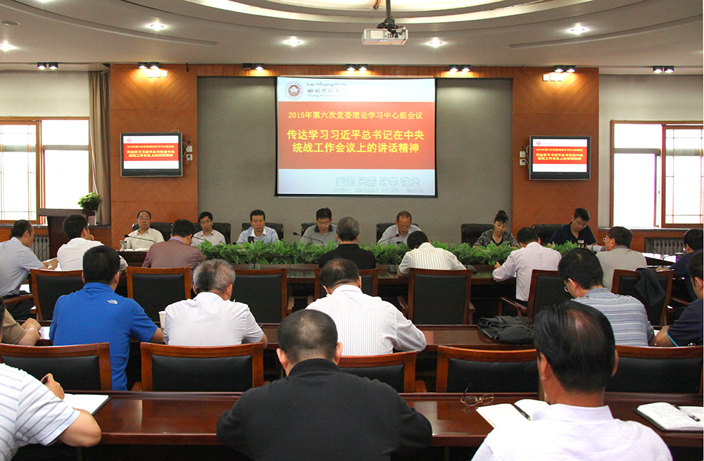 6月24日,学校党委理论学习中心组开展2015年第六次学习活动,传达学习习近平总书记在中央统战工作会议上的重要讲话精神和孙春兰同志在藏视察调研时的讲话精神,并对学校近期工作进行安排部署。会议由校党委副书记、校长扎西次仁主持,党委理论学习中心组全体成员参加了会议。