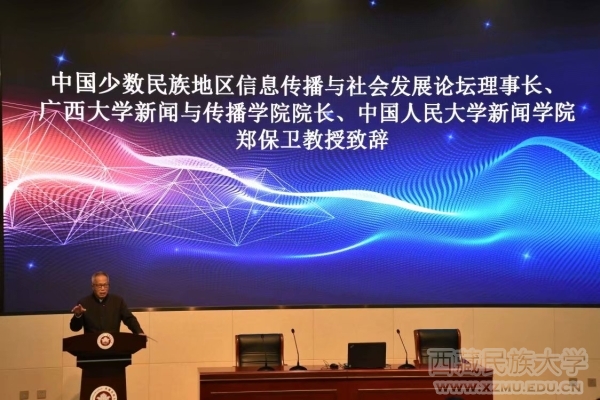 中国少数民族地区信息传播与社会发展论坛理事长、广西大学新闻与传播学院院长郑保卫教授致辞
