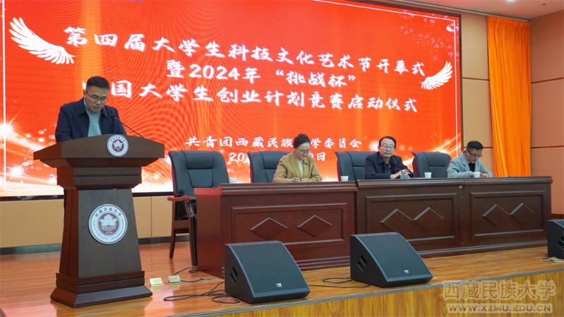 张宏伟致辞。他指出,大学生科技文化艺术节通过开展多形式、多类型的活动,为大学生成长成才提供平台,引领学生遵循“六有”要求茁壮成长,鼓励同学们积极参与。他强调,我校青年要牢记科技是第一生产力,人才是第一资源,创新是第一动力,要充分依托全国“挑战杯”、自治区“成才杯”等赛事平台,努力提升自身的创新意识和创业能力。张宏伟代表学校党委对同学们提出三点期望和要求:一是坚持科教融通,争做科技创新的时代弄潮儿;二是坚持手脑并用,争做改革创新的躬身实践者;三是坚持五育并举,争做科技创新的奋进追梦人。最后,张宏伟宣布西藏民族大学第四届大学生科技文化艺术节暨2024年“挑战杯”启动仪式开幕。