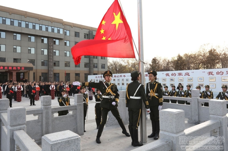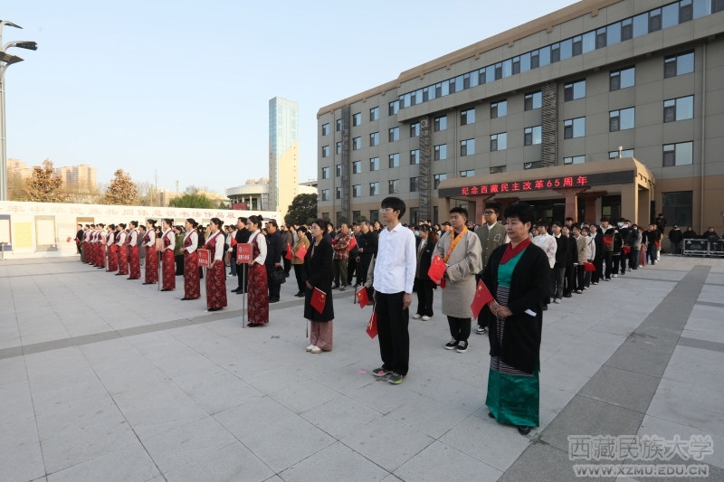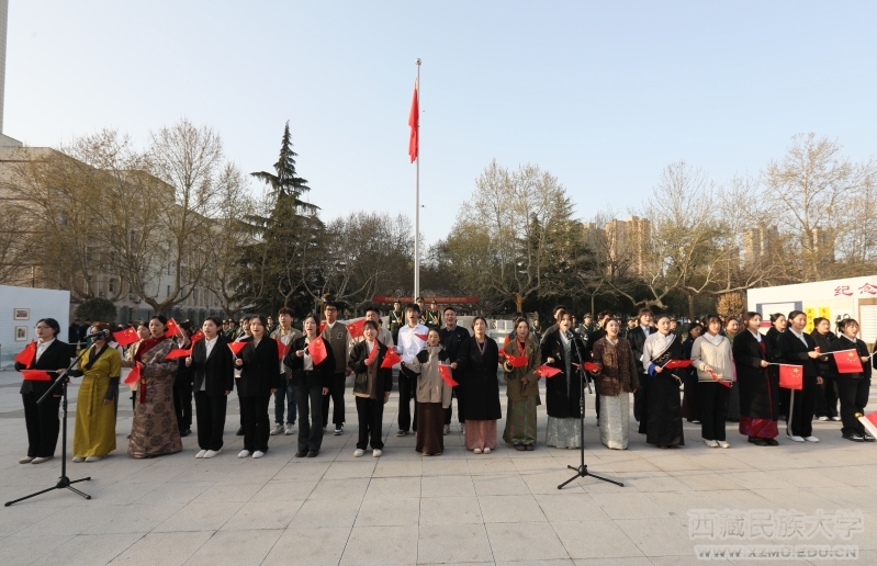 回望来时路,阔步新征程。为纪念西藏民主改革65周年,3月28日清晨,学校270余名师生代表及西藏自治区人民政府驻西安办事处咸阳干休所职工代表身着节日的服装齐聚渭城校区立德楼前广场,隆重举行升国旗、唱国歌活动,感恩伟大时代、汲取奋进力量。学校领导刘凯、罗旺次仁、次仁旺堆、史本林、马静、任晓伟、扎堆、次旦玉珍、陈敦山出席活动。活动由学校党委副书记、校长罗旺次仁主持。离退休干部朱红老师和医学院次仁曲宗同学作国旗下的讲话。